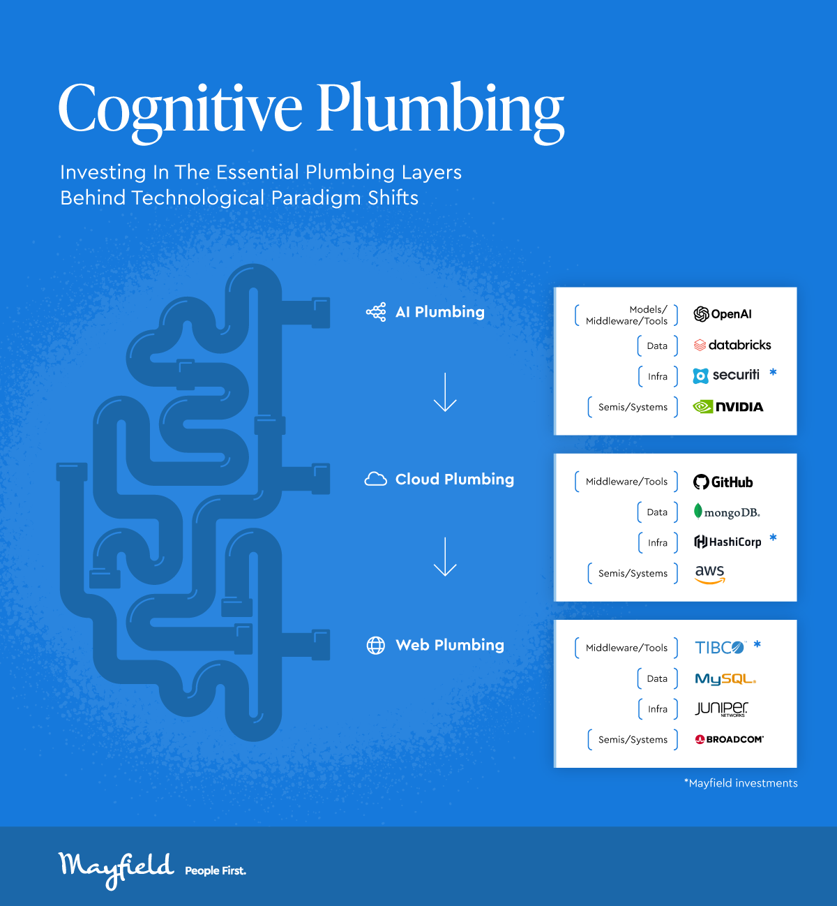 Mayfield’s conviction in infrastructure investments began 25+ years ago, as I have been a believer in the power of plumbing to help consumers and businesses realize the benefits of technology waves. During the Web era, I joined a long line of tech industry school dropouts to co-found my first company in 1996 with my PhD advisor at Stanford University. VXtreme made it possible to stream video over the Internet, and after its acquisition by Microsoft, endures as Windows Media. While at Microsoft, I invested in Akamai, which delivered infrastructure to scale the Web.